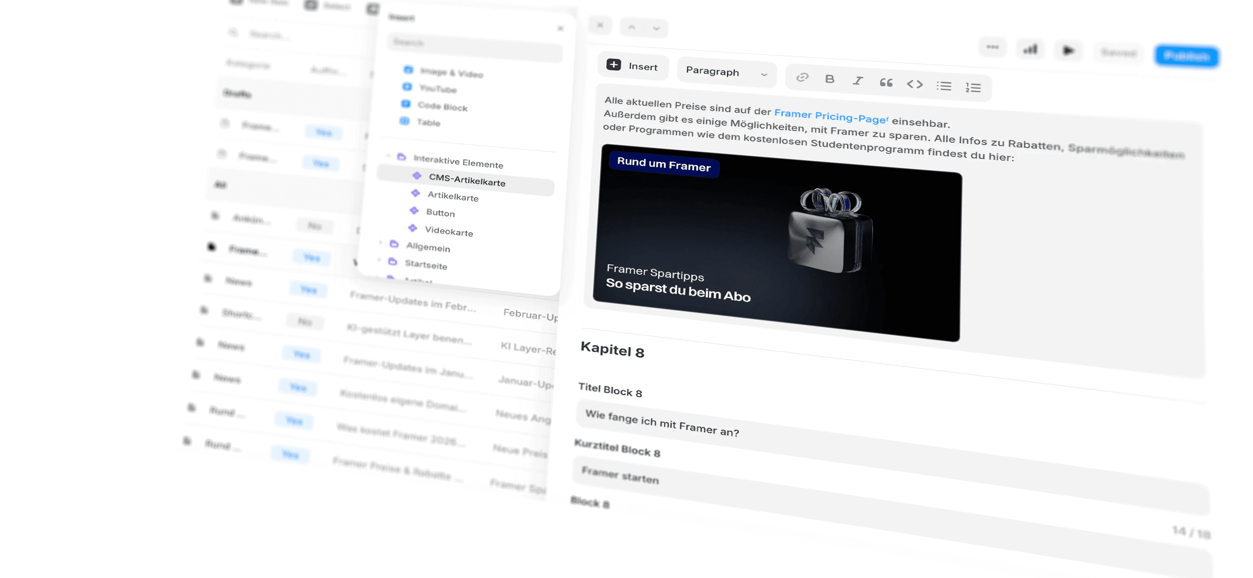 Stell dir vor, du schreibst einen Blogpost in Framer. Zwischen zwei Absätzen willst du dein Newsletter-Signup-Formular platzieren. Oder du schreibst ein Tutorial und möchtest mitten im Text eine live-animierte Demo einbetten. Bisher war das nicht möglich. Der CMS-Editor war auf Text, Bilder, Videos und einfache Tabellen beschränkt. Seit dem 10. Februar 2026 ist das anders: Mit dem CMS Components-Update kannst du jede Komponente, die du auf deinem Canvas erstellt hast, direkt in deine CMS-Inhalte einbetten. Mitten zwischen Absätzen, vollständig flexibel, mit allen Variablen und Varianten. Was das konkret bedeutet: Eine Komponente in Framer ist ein wiederverwendbares Designelement, erkennbar an der lila Umrandung auf dem Canvas. Das kann ein Button sein, eine Karte, ein animierter Ticker, ein Signup-Formular oder eine Bildergalerie. Diese Elemente waren bisher auf der Designebene beheimatet. Jetzt können sie direkt im Inhalt verwendet werden.